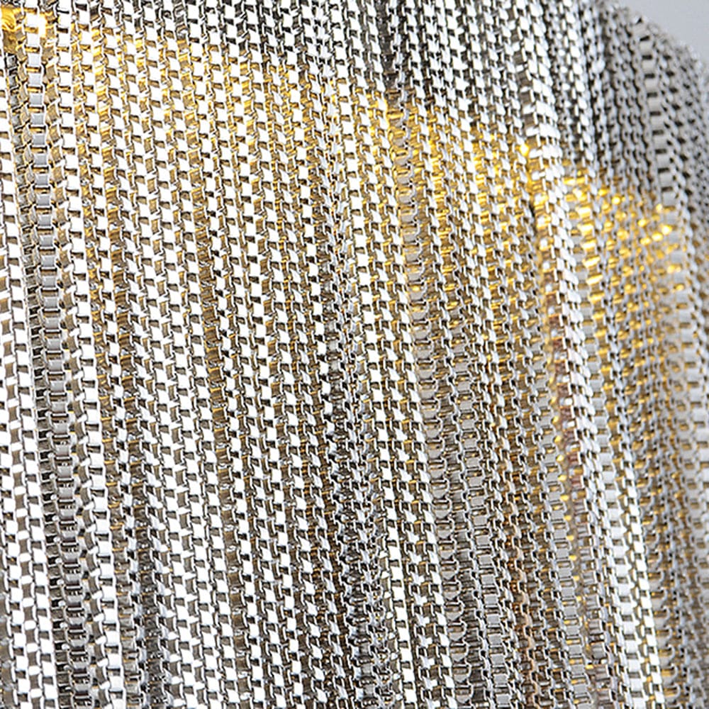 - The chandelier SHIMMERLINE features a circular base with a vertical rod that supports a cascading fringe shade adorned with decorative chains. It's crafted from metal with a polished finish and available in up to three tiers. The color options include silver, rose gold, or gold, and it offers a 3-color change feature for light (white to warm). Diameters range from 15.7 cm to 31.5 cm, enabling customization in single—or multi-tier setups.