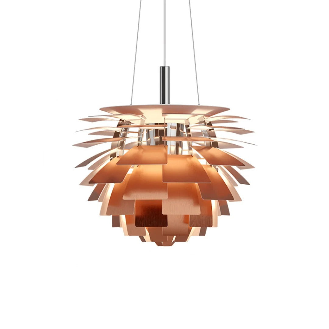 • The chandelier PRISMOFLARE showcases a layered spherical design with overlapping panels around a central rod, creating a cascading pine cone effect. Made from aluminum with a painted finish, it is available in white, silver, or orange. The chandelier comes in diameters ranging from 48 cm to 72 cm, offering versatile configurations to fit different spaces.